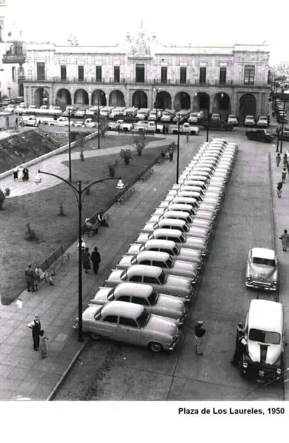 Avenida Juárez a su cruce con la Calle Colón, en la Zona Centro de Guadalajara, frente a la Plaza de la Universidad. La imagen antigua de inicio de los años 50'S.